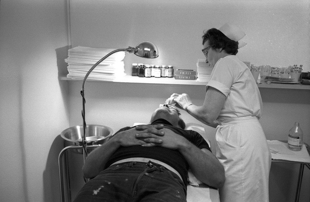 Медсестра осматривает Сони, который повредил голову, разбившись на мотоцикле.